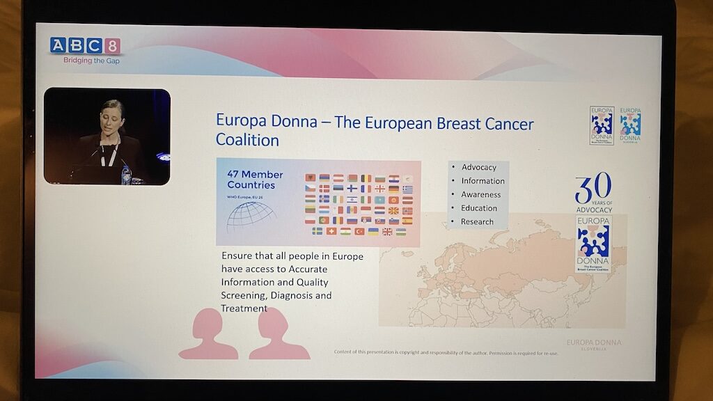 Seit meiner Metastasen Diagnose 2022 weiß ich ja: Der Krebs geht nicht mehr weg. Das hat sehr viel für mich verändert in meinem Leben. Letztes Jahr habe ich dann zufällig Europa Donna kennengelernt, die europäische Brustkrebs Koalition. Im Mai war ich in Mailand auf dem Patient Advocacy Basic Training und aktuell befinden wir uns in der Gründungsphase von Europa Donna Deutschland. Und auf der ABC8 war ich eben auch zum ersten Mal als Patient Advocate unterwegs.