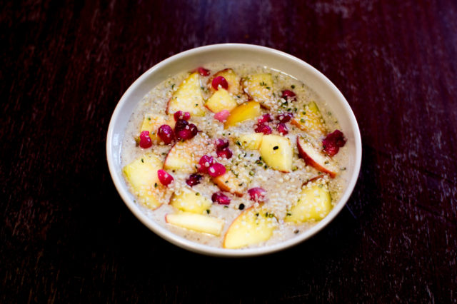 Nun den Brei in ein Schälchen geben und das Obst (in meinem Fall Apfel und Granatapfelkerne) obendrauf legen. Zum Schluss noch mit ein paar Hanfnüssen bestreuen. Fertig.