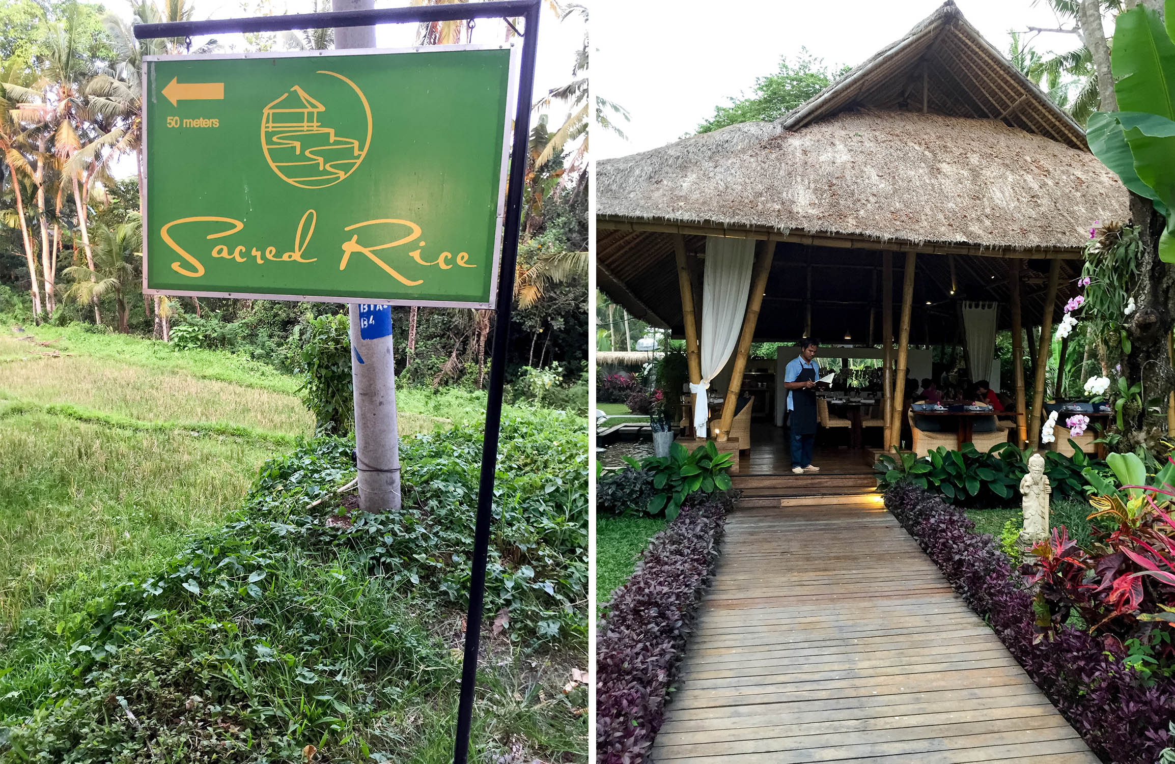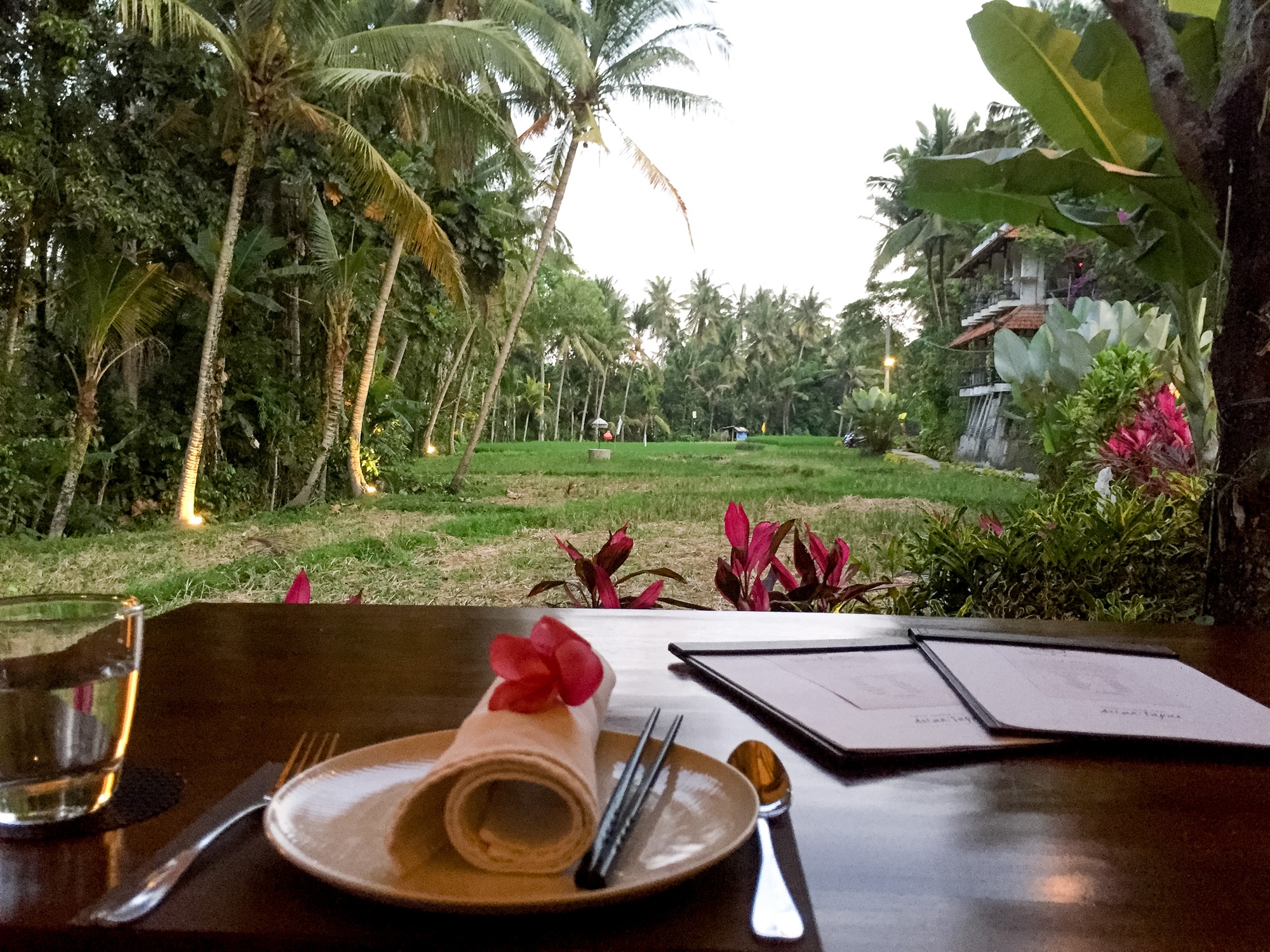 Wir haben mittags dann eine kleine ca. 2stündige Pause im Hotel gemacht, weil die Kombi aus Hitze, Feuchtigkeit und Anstrengung durchaus geschlaucht hat. Abends sind wir dann zum Essen in das Sacred Rice gegangen. Das ist absolut empfehlenswert und das Restaurant liegt mitten in den Reisterrassen. Wir bekamen zu Beginn sogar noch eine kleine Führung durch den eigenen Garten (der traumhaft ist! Ein bisschen wild und verwunschen und absolut gar nicht wie deutsche „ordentiche“ Gärten). Es gab für uns eine Auswahl an vegetarischen Tapas mit himmlischem Kokosreis und Nachtisch.