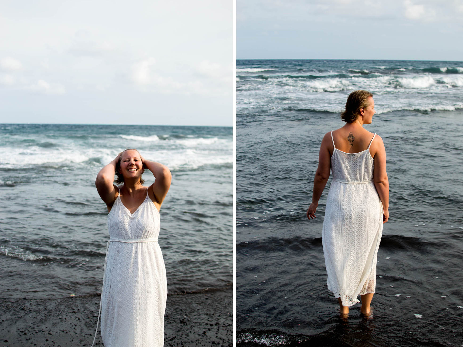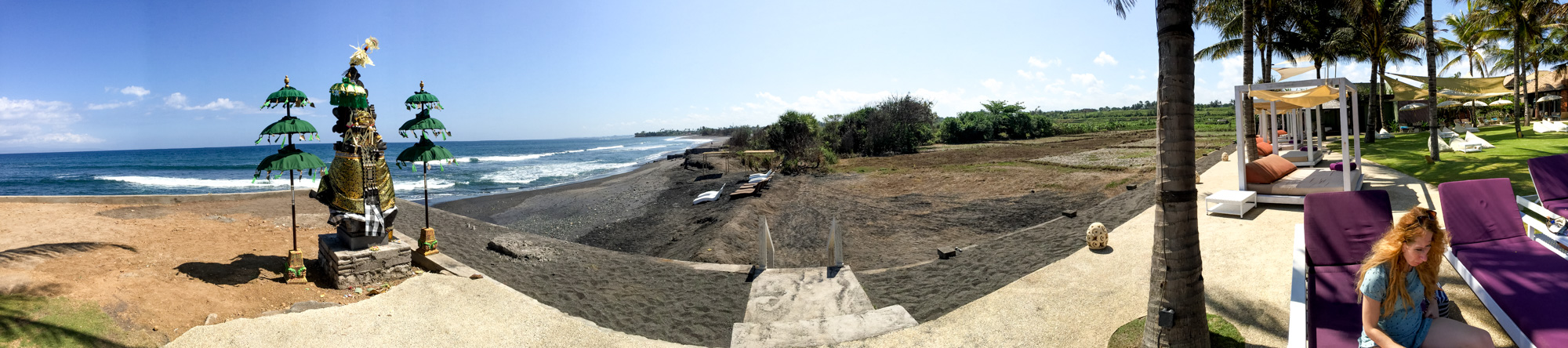 Um 13 Uhr ging es dann los zum nächsten Hotel, das Royal Purnama. Wir konnten hier erst um 14 Uhr einchecken und haben uns solange im hauseigenen Standing Stones Restaurant aufgehalten und direkt was gegessen. Der Ausblick ist traumhaft und direkt aufs Meer. Spannend und typisch für die Gegend hier ist wohl der schwarze Sand am Strand.