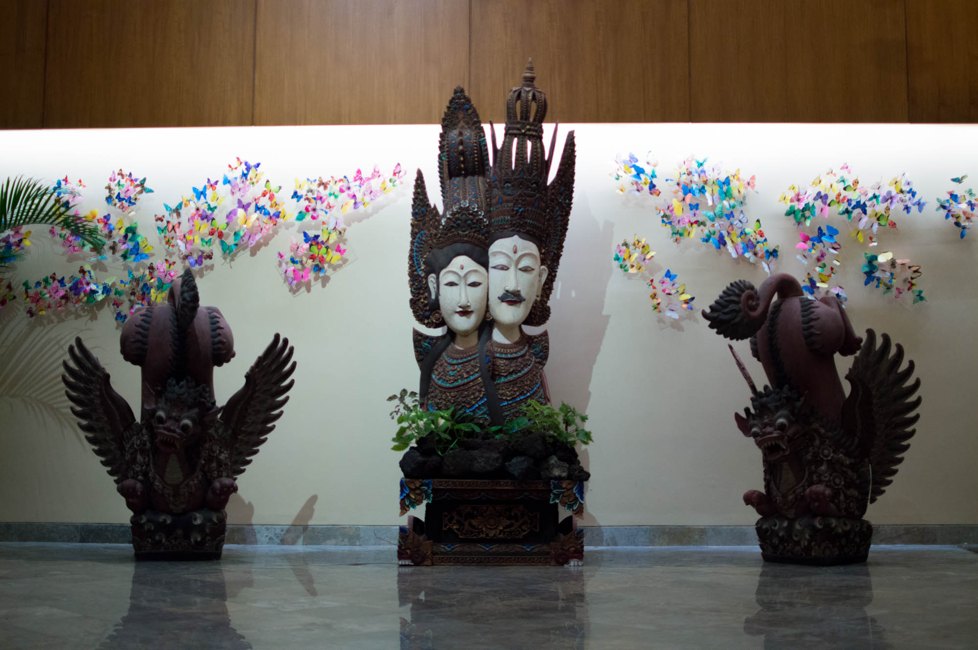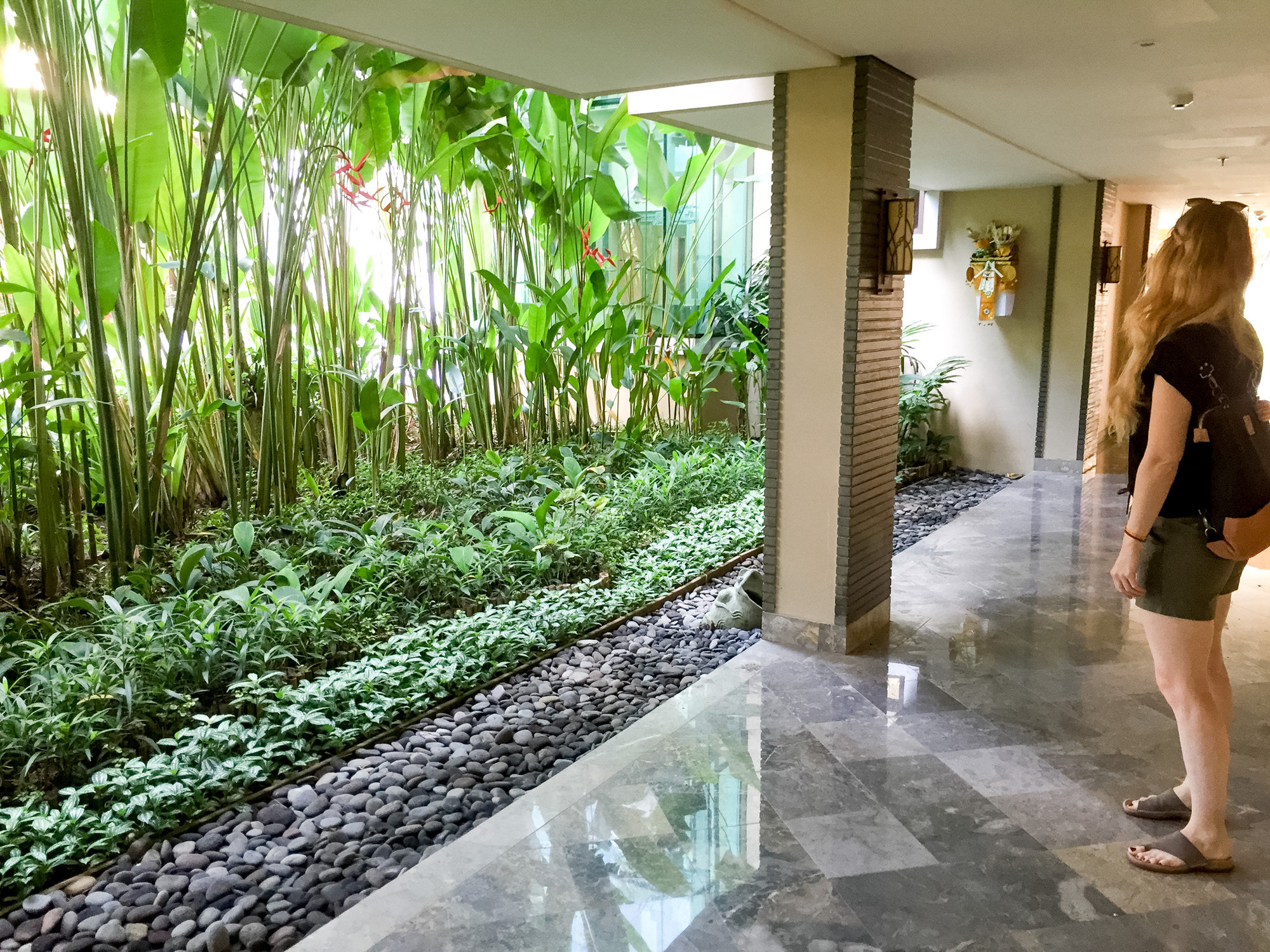 Gefühlte drei Kontrollen später waren wir am Kofferband und durften noch ungefähr eine Stunde warten, bis wir unsere Koffer hatten. Raus aus dem klimatisierten Flughafen und rein in die tropische Hitze. Warm, feucht, stickig. WOW! An der Seite standen Menschen in Schlangen mit Schildern, auf denen die Namen von Passagieren oder vom Hotel standen. Soo viele. Nur unseres nicht dabei. Wir wurden direkt angequatscht und hatten natürlich direkt das Gefühl, dass uns irgendwer was verkaufen oder uns über den Tisch ziehen will. Aber Fehlanzeige. Die Menschen sind alle so super nett und dieser hier brachte uns an eine Art Infoschalter, wo unser Fahrer ausgerufen wurde und dann auch tatsächlich kam. Im Auto bekamen wir erst mal ein kaltes und feuchtes Handtuch für den Kopf, ein Begrüßungsgetränk und Kekse. ^^ Toller Service! Eine Stunde durch den balinesischen Verkehr waren wir dann endlich am Hotel SereS Springs Resort & Spa. Es war inzwischen schon ca. 21.30 Uhr und wir waren ziemlich kaputt aber hungrig, also sind wir nach dem Check IN noch ins Hotelrestaurant, bevor wir dann endgültig ins Bett gefallen sind. Hier gab es übrigens jeden Abend Live Musik!