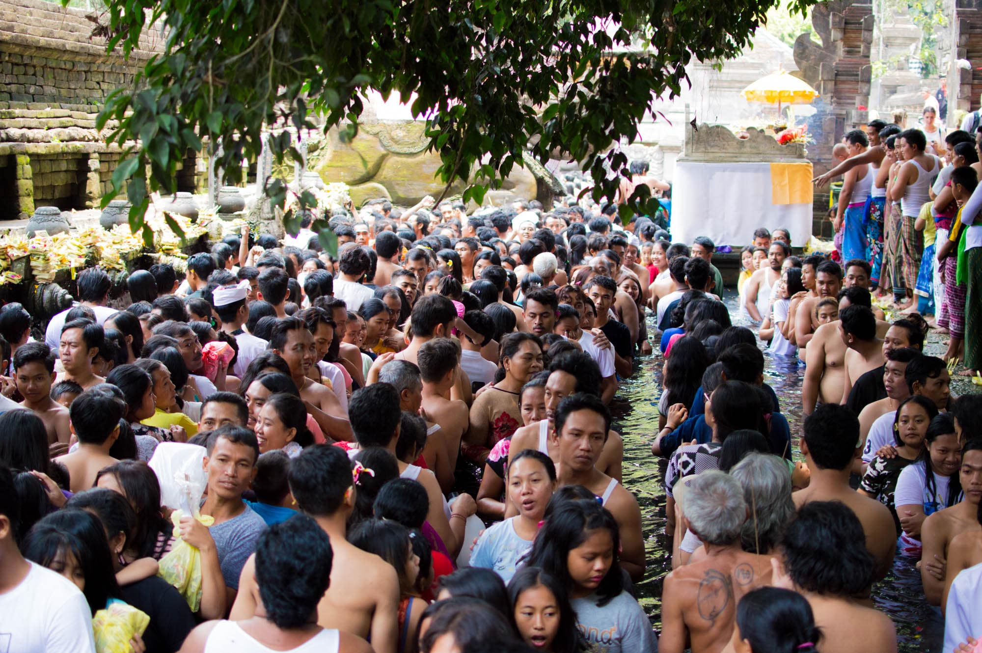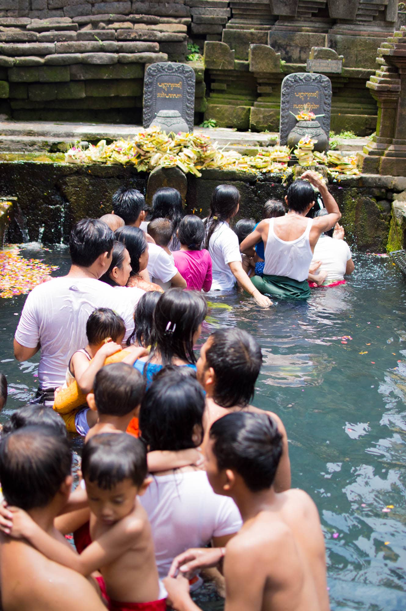 Anschließend ging es im Sarong in den Pool, wo wir den Kopf unter eine der Düsenduschen halten sollten. Man kann da auch beten wurde uns gesagt. Danach sollten wir uns wieder draußen hinstellen, die Hände offen halten und beten. Wir bekamen ein paar Reiskörner auf die Stirn geklebt, als Zeichen, dass wir diese Reinigungszeremonie durchlaufen haben. Das habe ich am Tag vorher auch bei vielen Leuten gesehen.