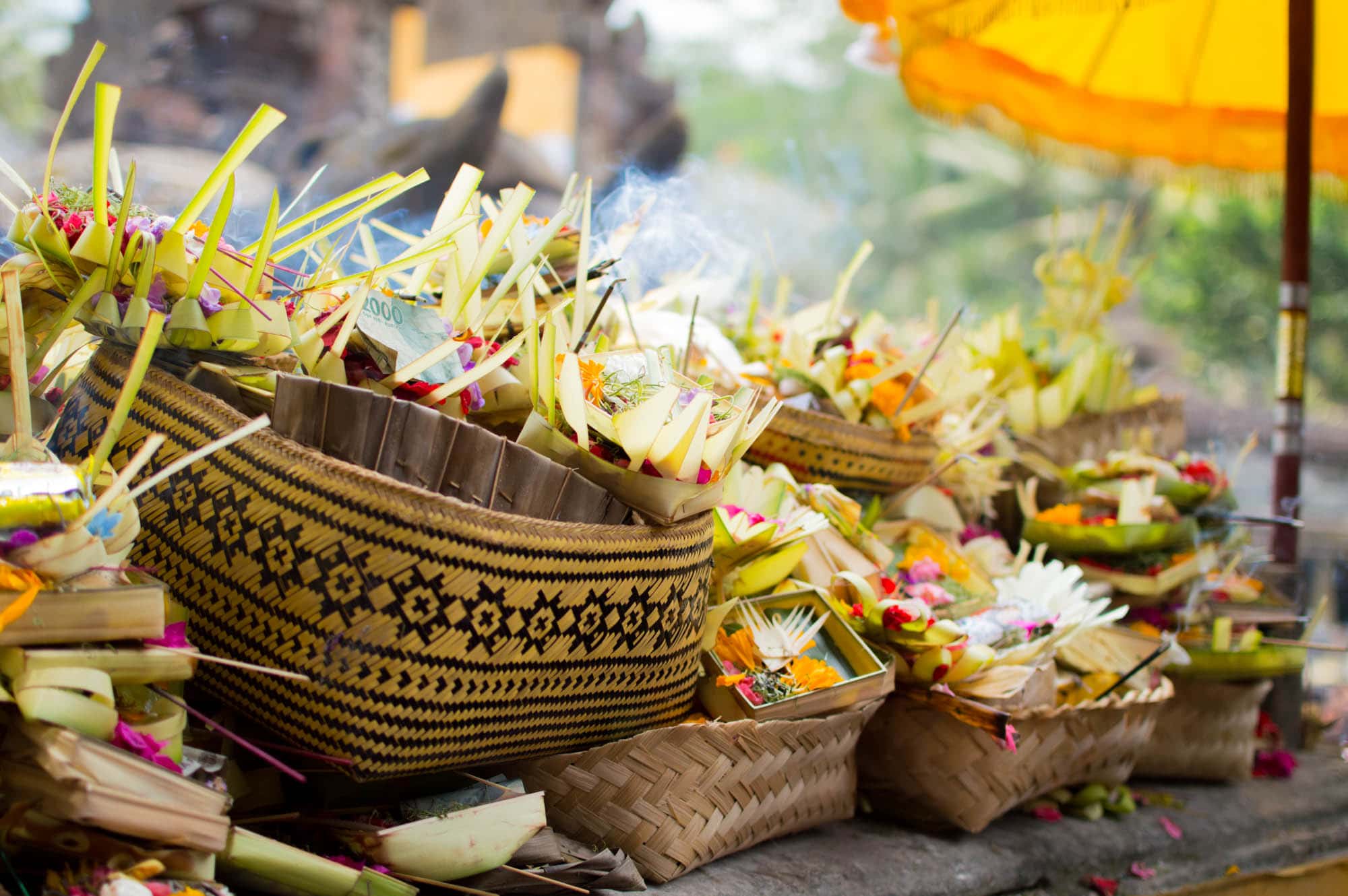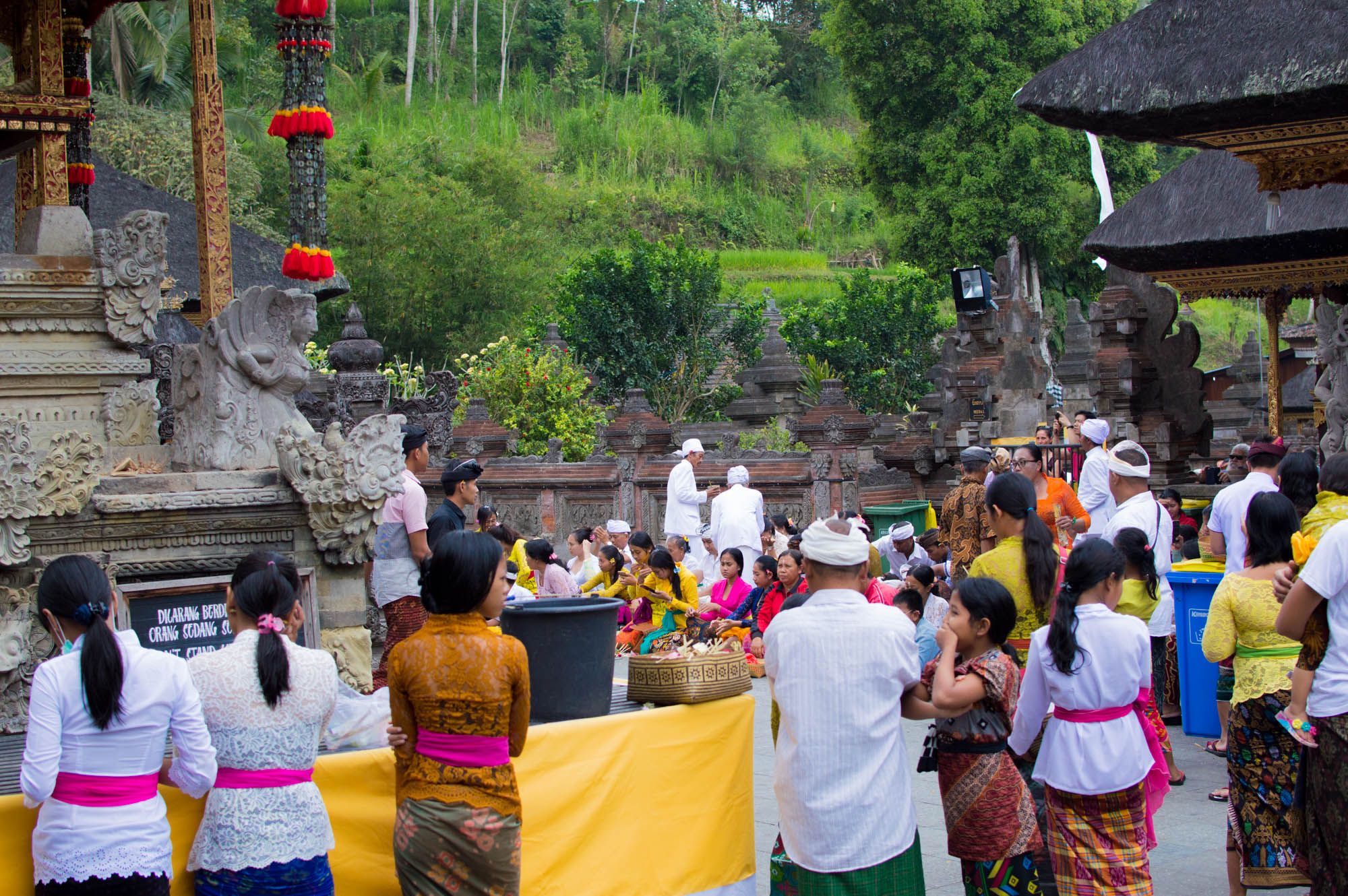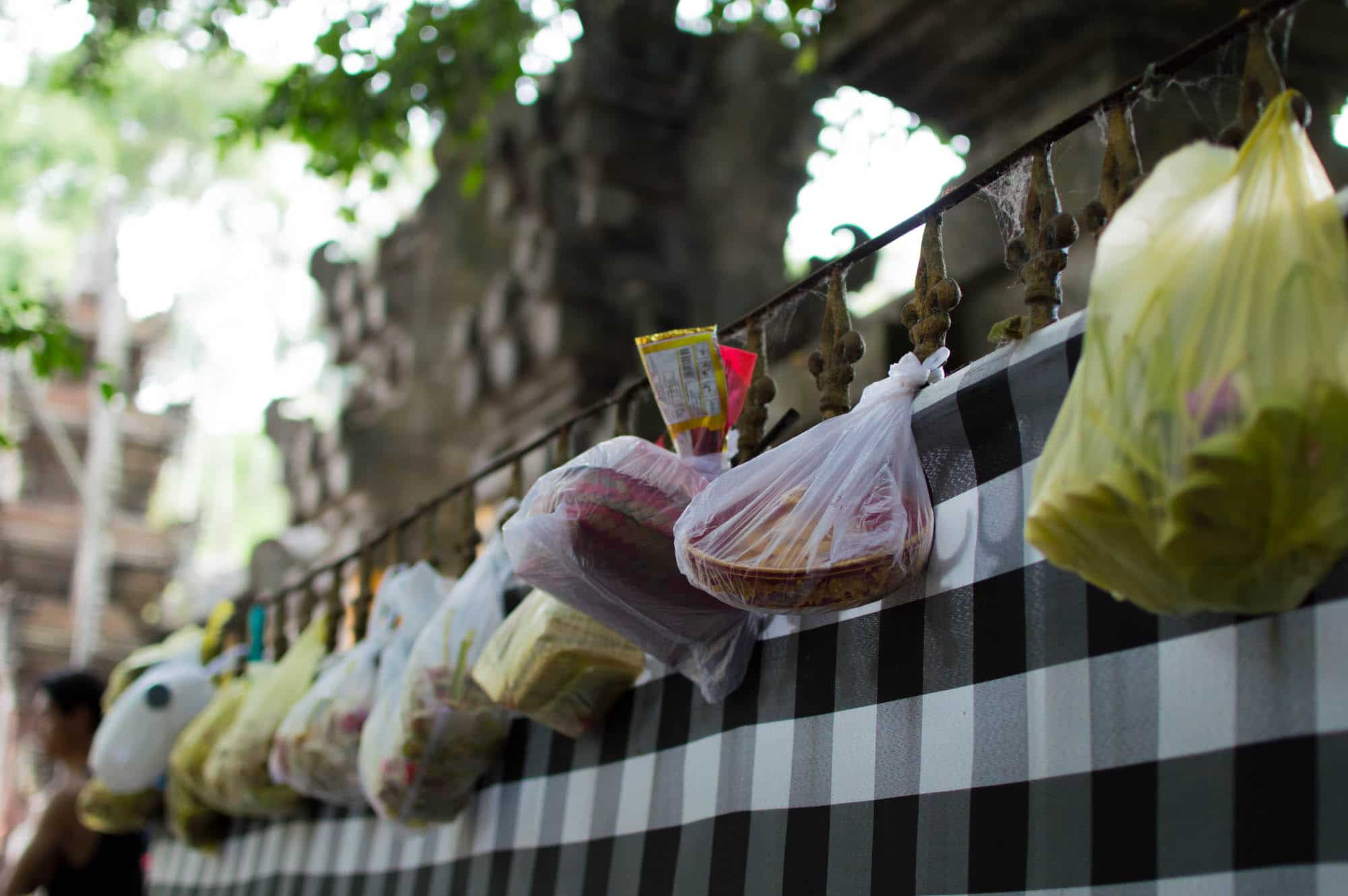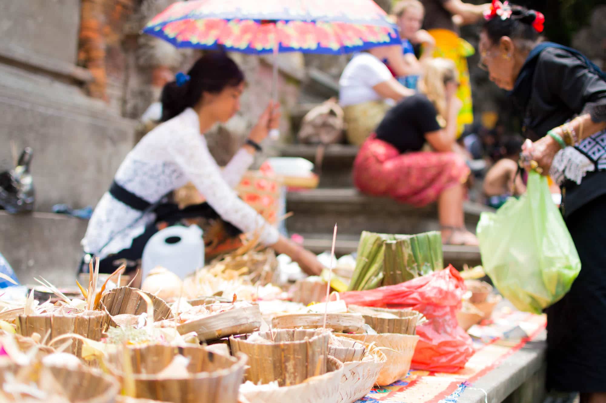 Danach ging es weiter zum Pura Tirta Empul Tempel und wir konnten dort die besonderen Rituale beobachten. An diesem Tag war hier nämlich ein Fest, an dem besondere Reinigungsrituale durchgeführt werden. Deshalb war an dem Tempel so viel los. Übrigens hatte unser Fahrer sogar Sarongs für uns im Auto, denn man darf den Tempel nur im Sarong betreten. Und überall die Opfergaben. Auf den folgenden Fotos könnt ihr sie gleich noch etwas besser sehen. Diese kleinen Schälchen aus Palmenblättern findet man wirklich ständig und überall.